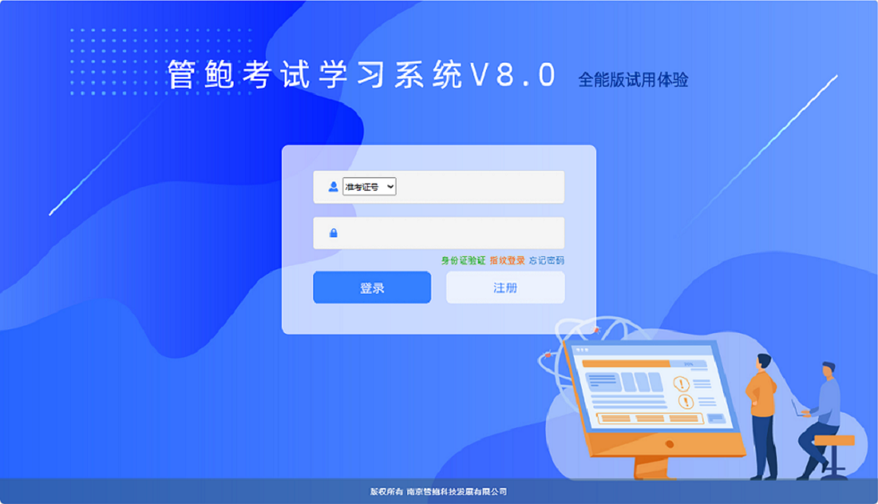 南京管鲍科技专注考试学习系统研发,旗下管鲍考试学习系统软件 V8.0(全能版),是面向全行业的专业在线考试系统,集在线考试、在线练习、模拟考试、在线培训、职业测评、绩效考评、调查公告于一体,全面满足教育、政府、公安、部队、电力、金融、医疗、企事业单位等多场景考核需求,为用户提供安全可靠、灵活扩展、简单易用的考试系统解决方案。